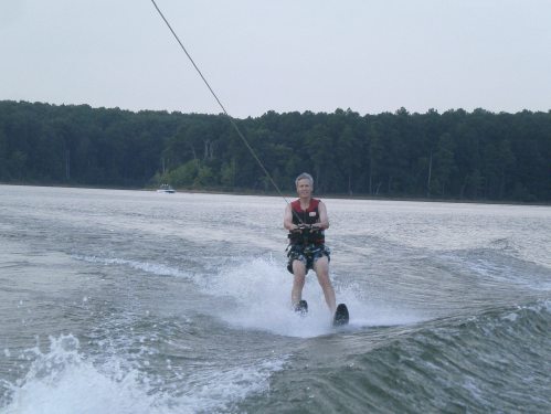 I had a small epiphany on this yesterday when our friends Ken and Carol took us out on Falls Lake for some water skiing. They both retired early, and do things they enjoy doing, like boating, tennis, and travelling. I have trouble imagining myself retired in this sense. But as we sat on their boat on the lake in the late afternoon, we talked about our lives, told stories, and swam a little, and enjoyed the lake and surrounding forest. Then we took turns getting pulled by their quick little boat on one of their various toys. Ken rode a hydrofoil chair and a wakeboard, and I had a go with old school water skis, which I enjoyed enormously. These things have deep value: sharing stories and experiences.