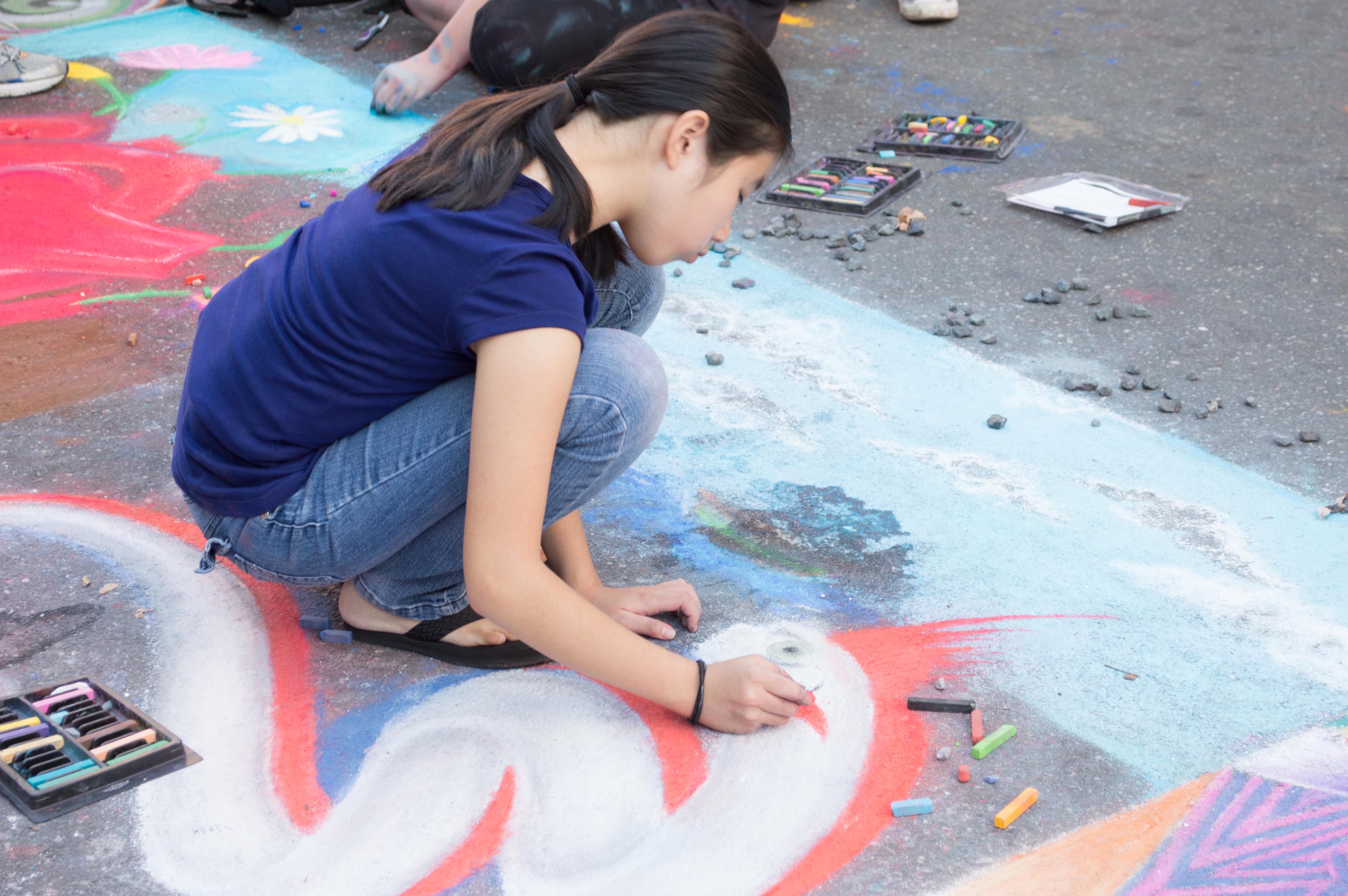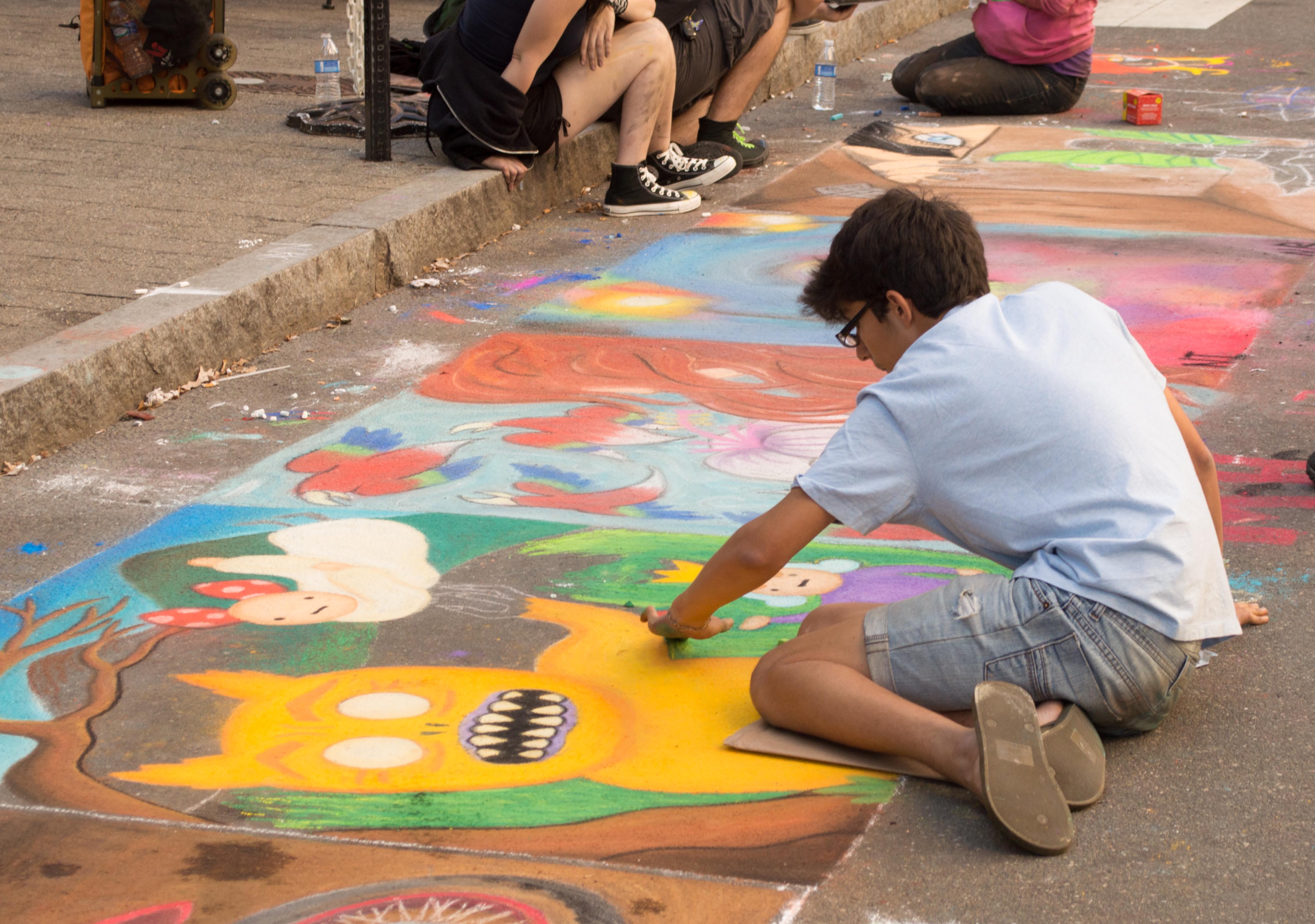 In the afternoon I practiced the piano with a view to getting ready for a lesson on Sunday with Olga. I considered playing a few holes of golf, but didn’t leave quite enough time, so intead I walked over to Fayetteville Street to see the SparkCon street fair. There were several musical groups performing, the loudest of which were, wouldn’t you know, the worst. There was a circus group and various craft and food stalls. My favorite part was the chalk sidewalk art. It’s not so much about artistic profundity as energy and life. Most of the artists were done by the time I got there, but a couple were still at work.