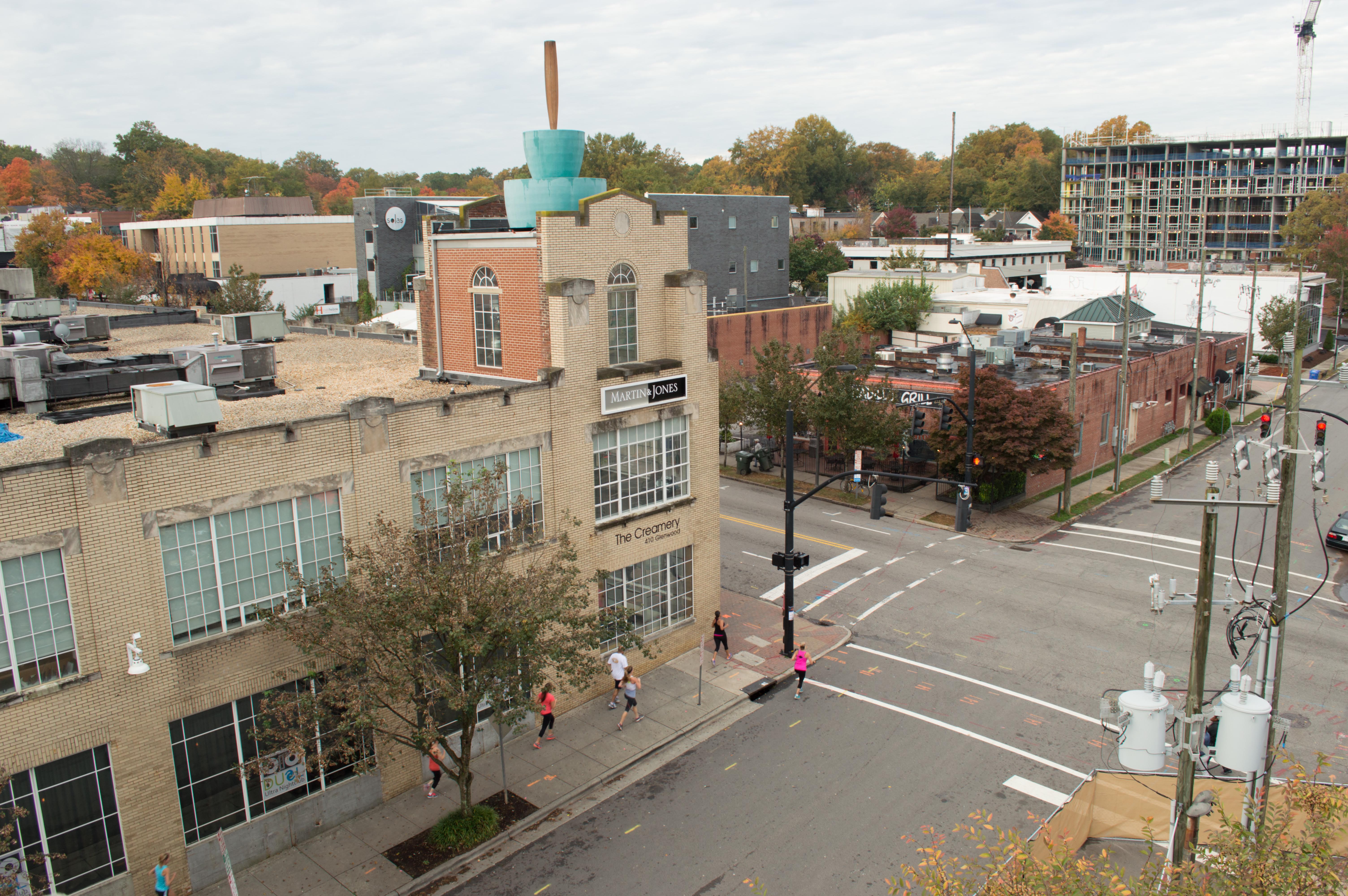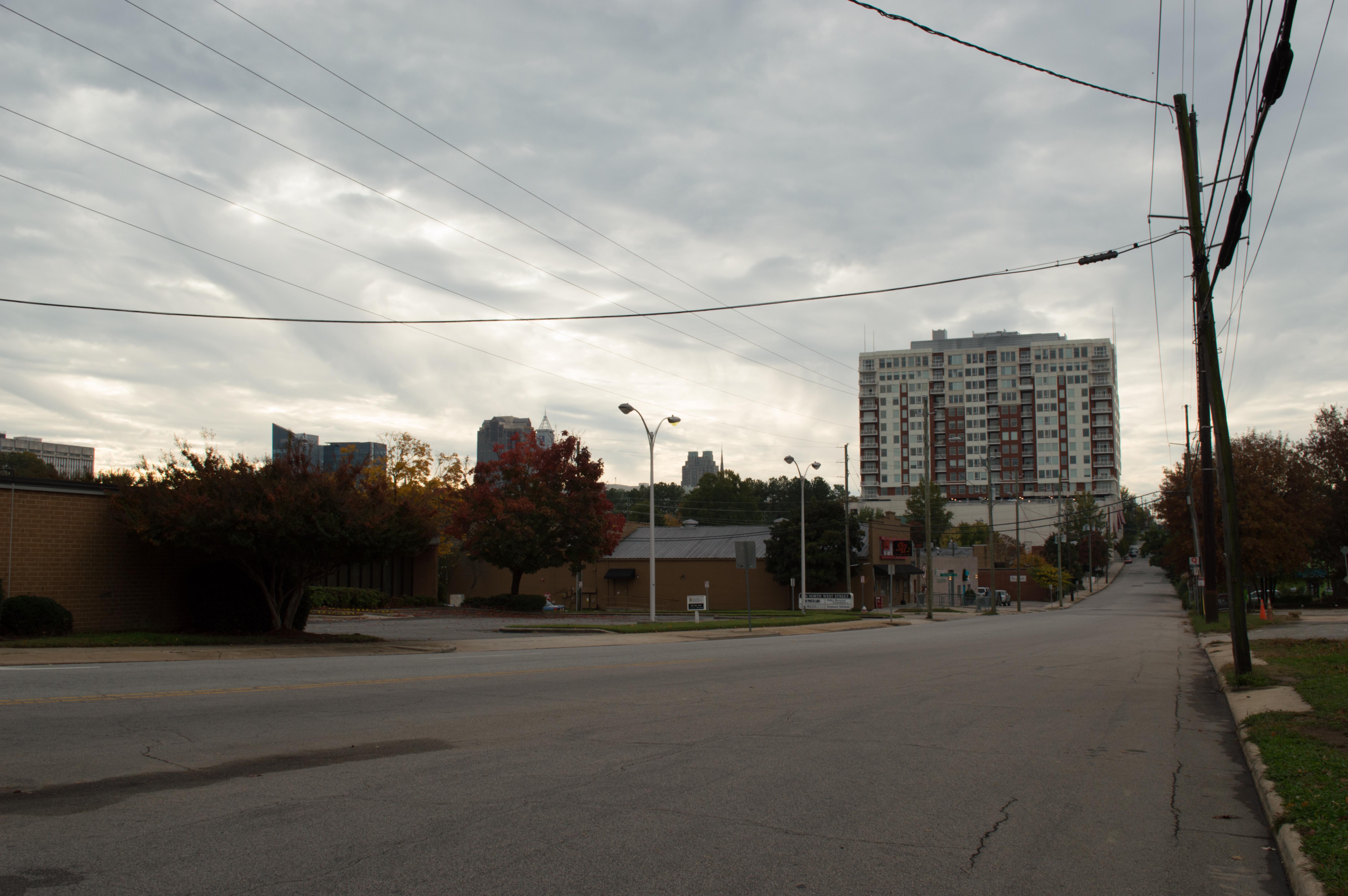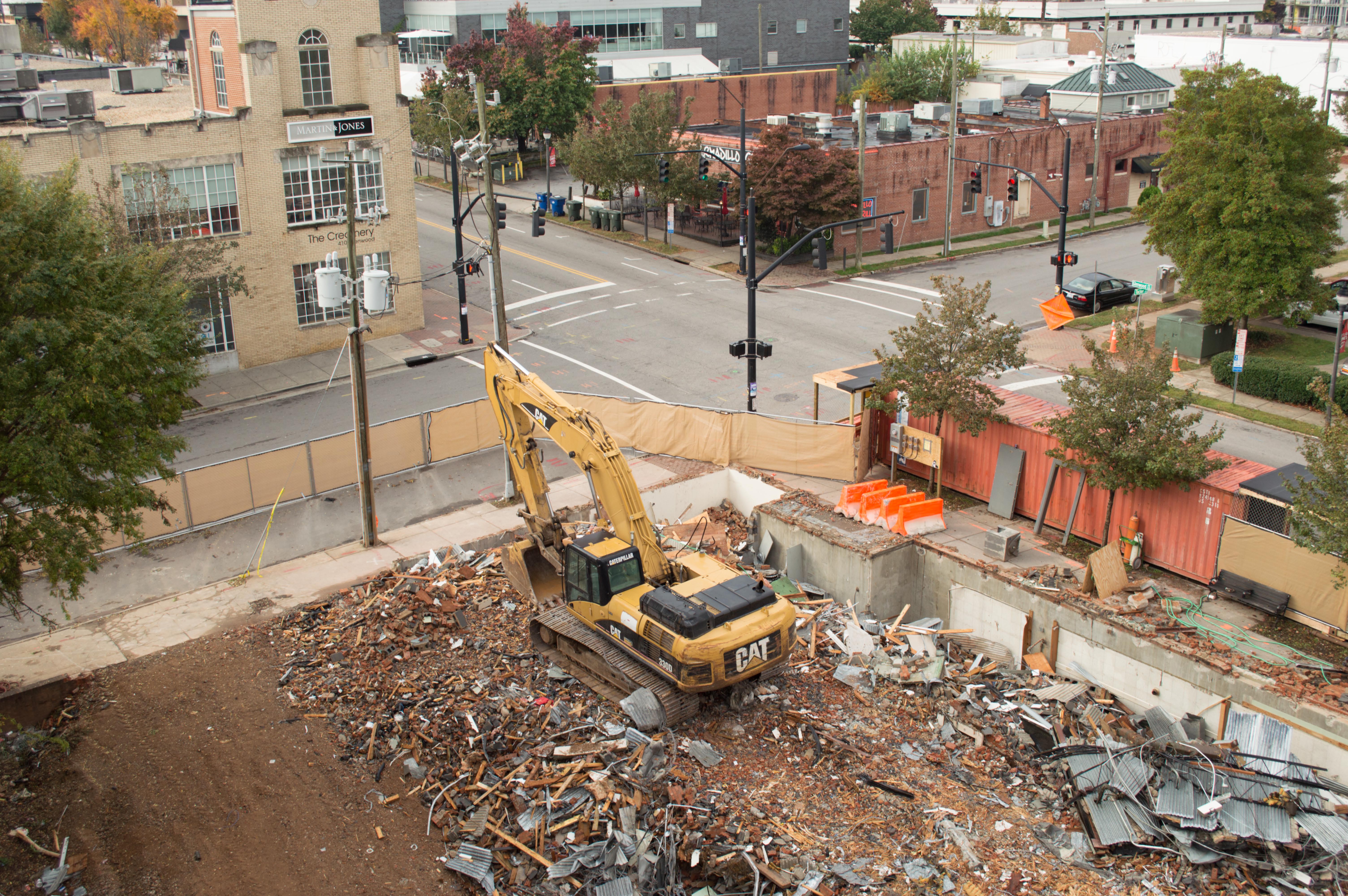 In our neighborhood, Glenwood South, there’s been a fair bit of construction, and also some destruction. Sally told me that an unattractive building on Glenwood across from the Creamery and catty-corner to the Armadillo Grill that had just been demolished, and I went over to inspect the site on Saturday morning. They’d walled off the site, but I got a good view from the adjacent parking deck. Sure enough, all that was left was rubble. It was overcast, but there was still a nice quality to the light, and I took some other pictures of the neighborhood on my walk over to the gym.
