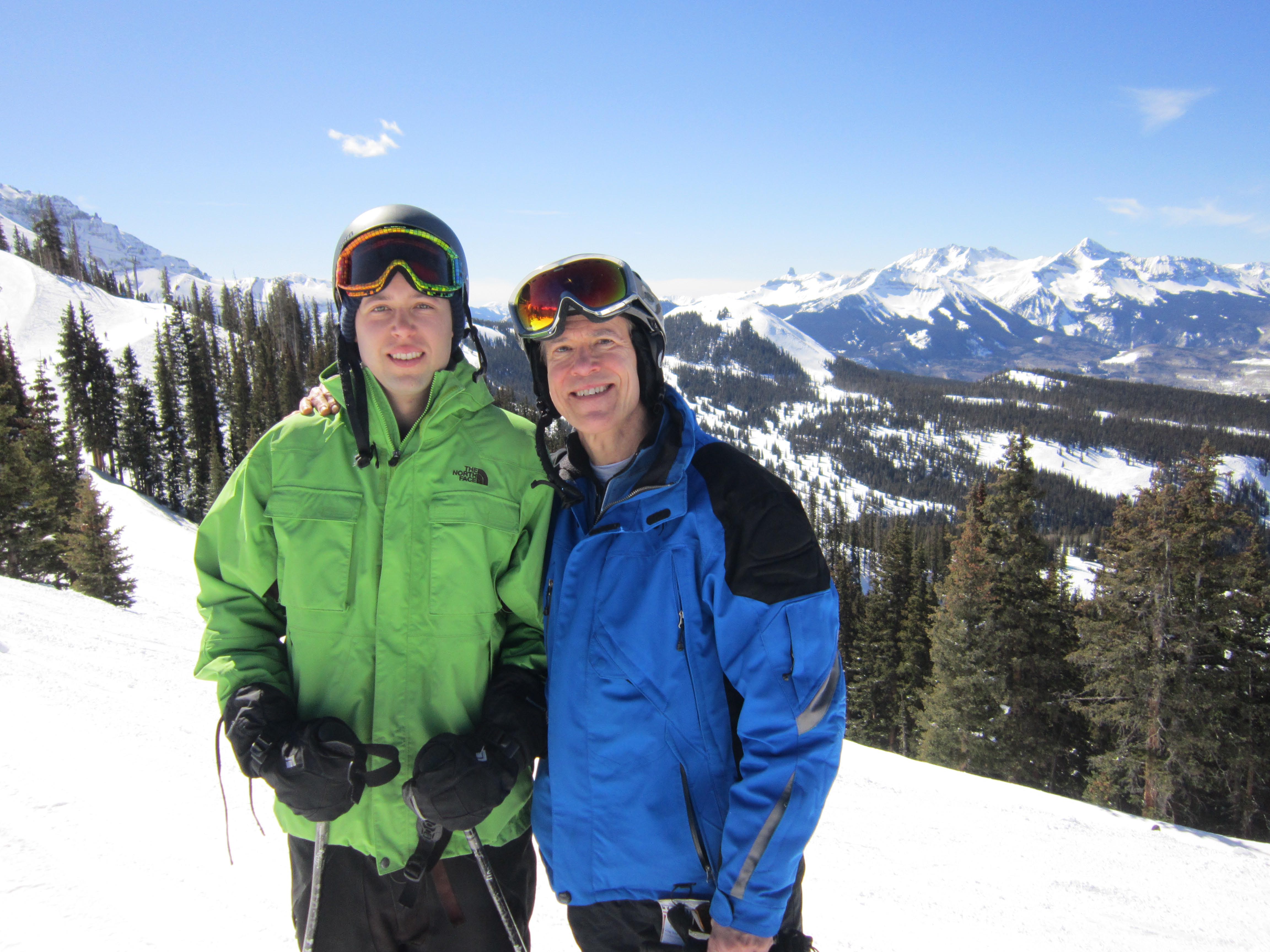 Our four ski days were all remarkably clear and sunny, with pleasant ski temperatures in the mid-30s. The snow was generally good – not too hard and not too soft – Goldilocks snow. Of course, it’s always a treat to get fresh light powder, but if it doesn’t happen, I’ll take bluebird days and Goldilocks. We were on the lifts almost as soon as they opened at nine and went at it hard until 3:30 or so. Then hot tub, relaxing, cocktails, and dinner. We particularly enjoyed eating at the Telluride Bistro, Siam, 221, and Hongas.