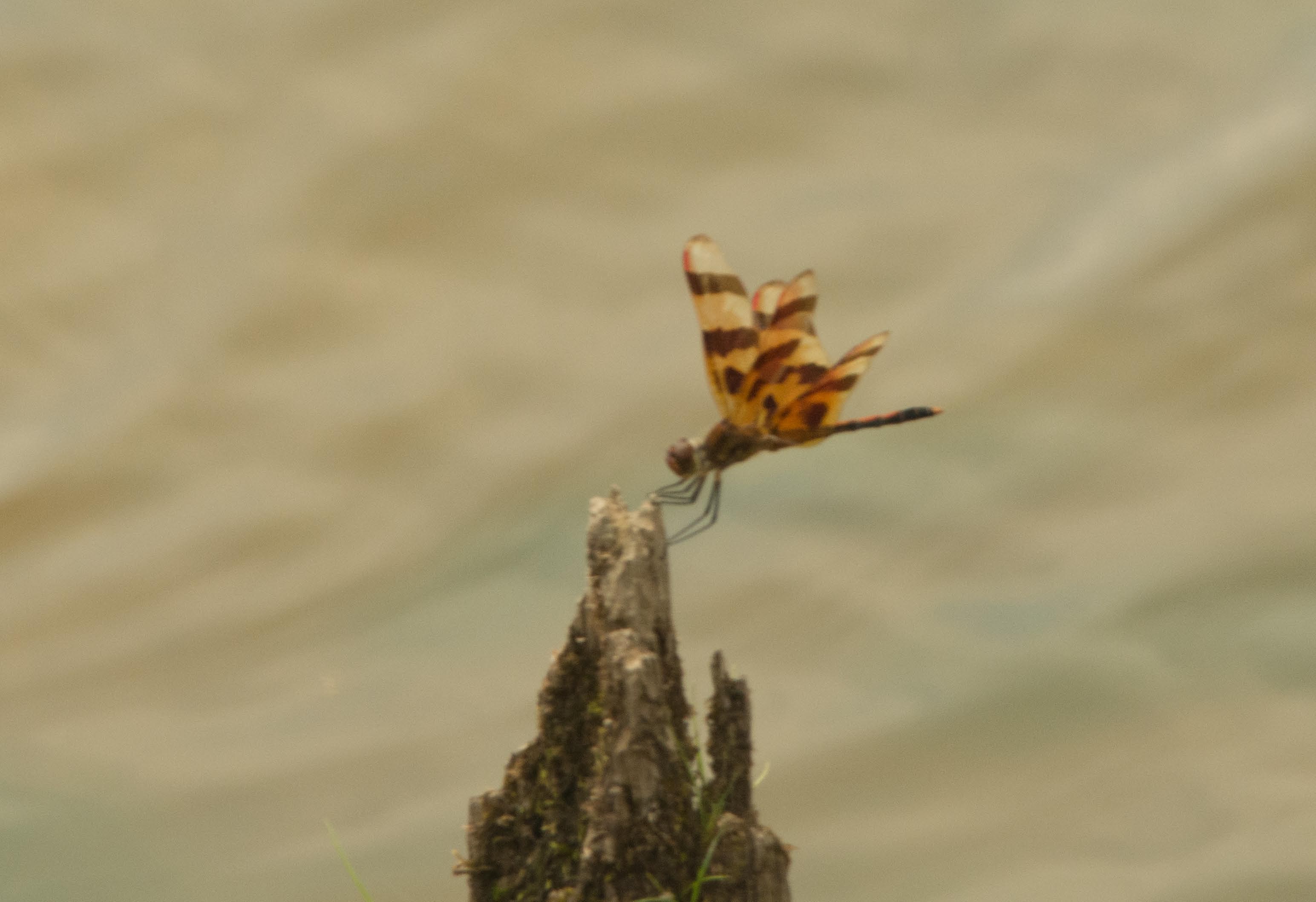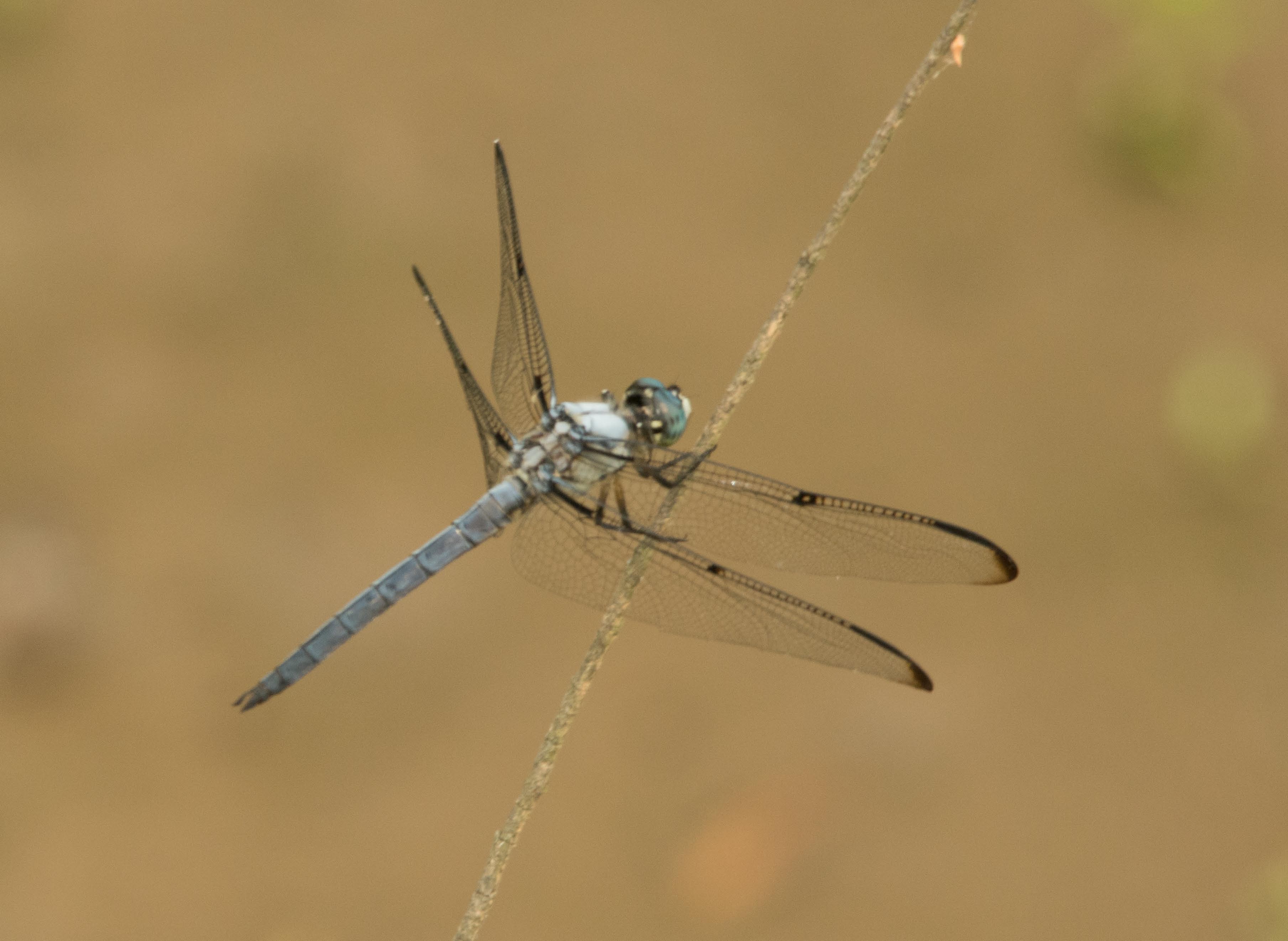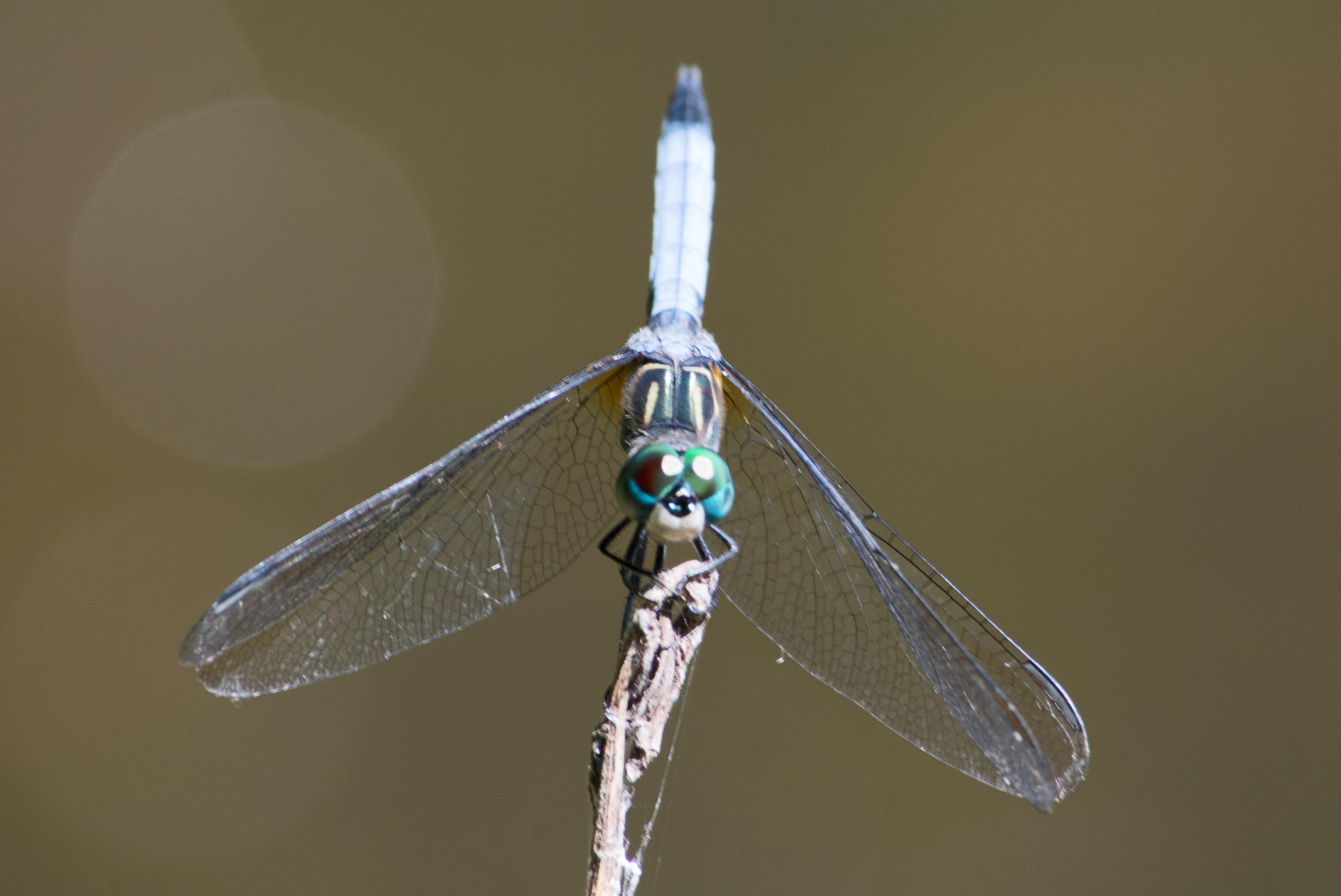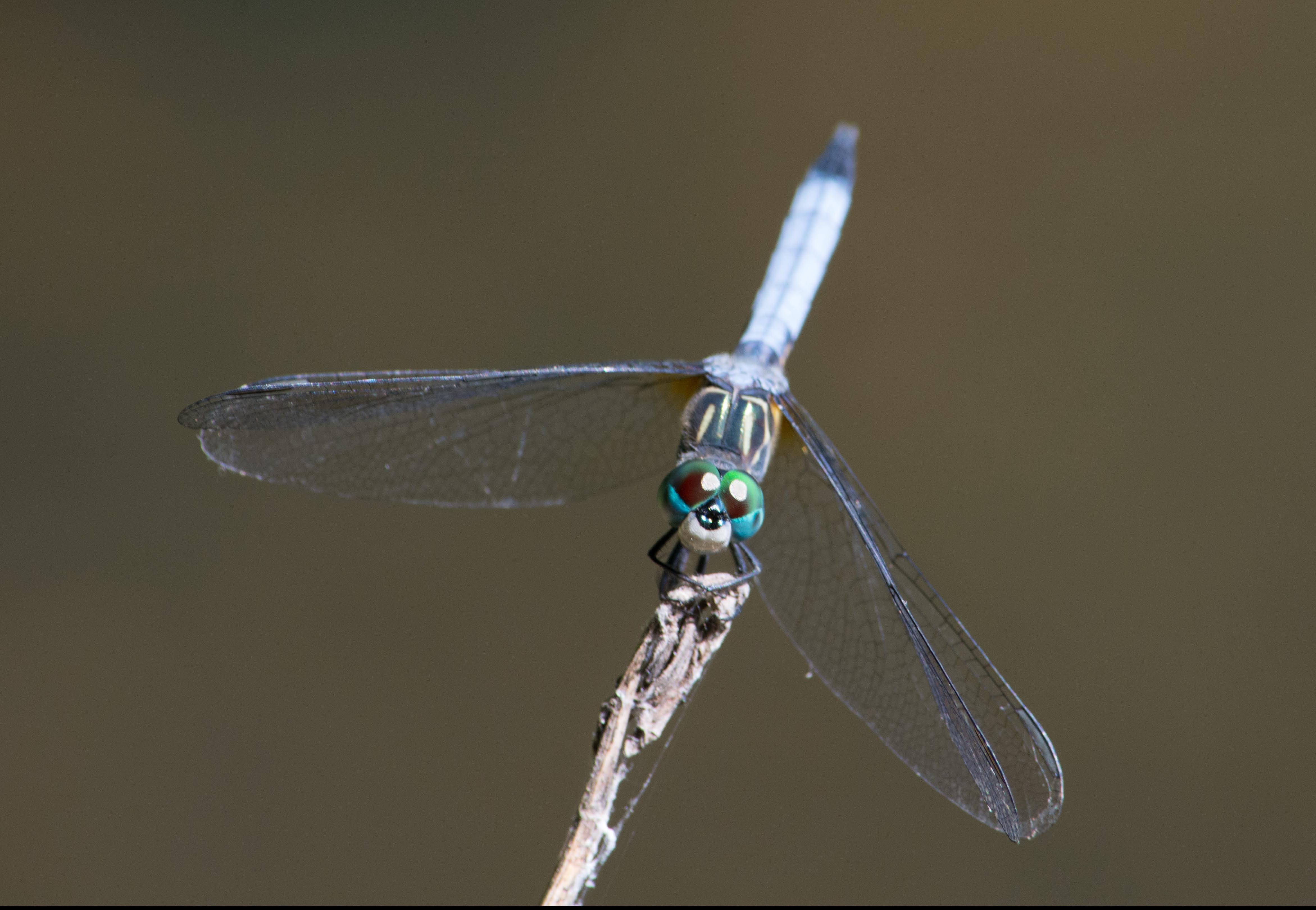 I spent some quality time this weekend with my camera looking for dragonflies. They are amazing aerialists, with the ability to hover, fly backwards and upside down, and attain speeds upwards of 30 miles an hour. They eat mosquitos, among other prey. Their eyes are the largest in the insect world, taking up most of their head and allowing them to look in all directions. And up close, some are quite beautiful. At the boardwalk over the swamp at Raleigh Boulevard, I found great blue skimmers, common whitetails, Halloween pennants, along with others who buzzed about but declined to perch for a picture. At Lake Lynn, I found a particularly cooperative blue dasher, who did a series of quick poses for me, three of which are below.