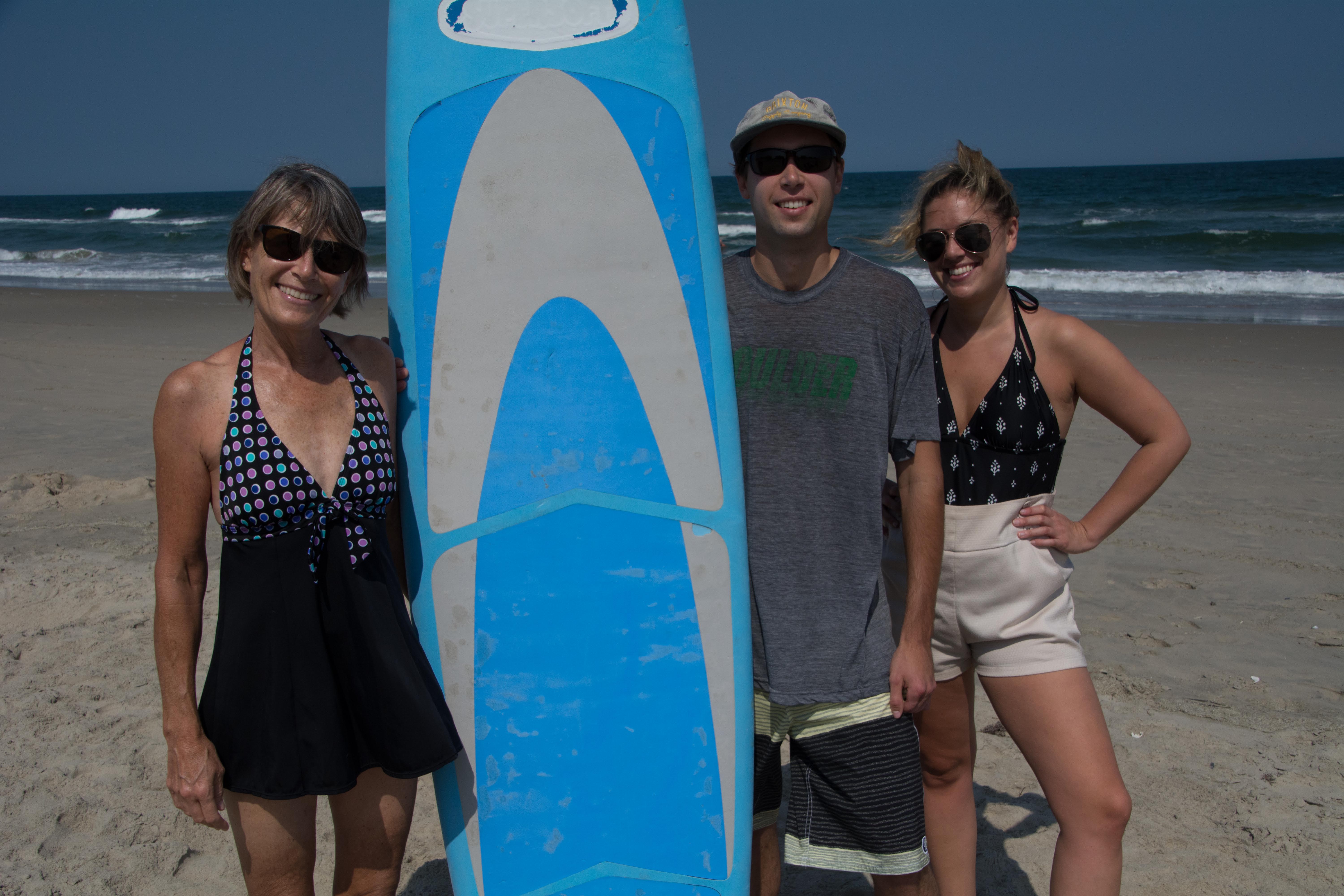 The beach at Corolla was wide, clean, and not at all crowded. The days were sunny and breezy. The water was cool at first. We tried out a surfboard, but had better success catching waves with boogie boards. I had one excellent ride of perhaps a hundred yards. On Sunday we went out about 3:30 in the afternoon, and I wrongly figured that sunblock would not be needed. Got a bit pink.