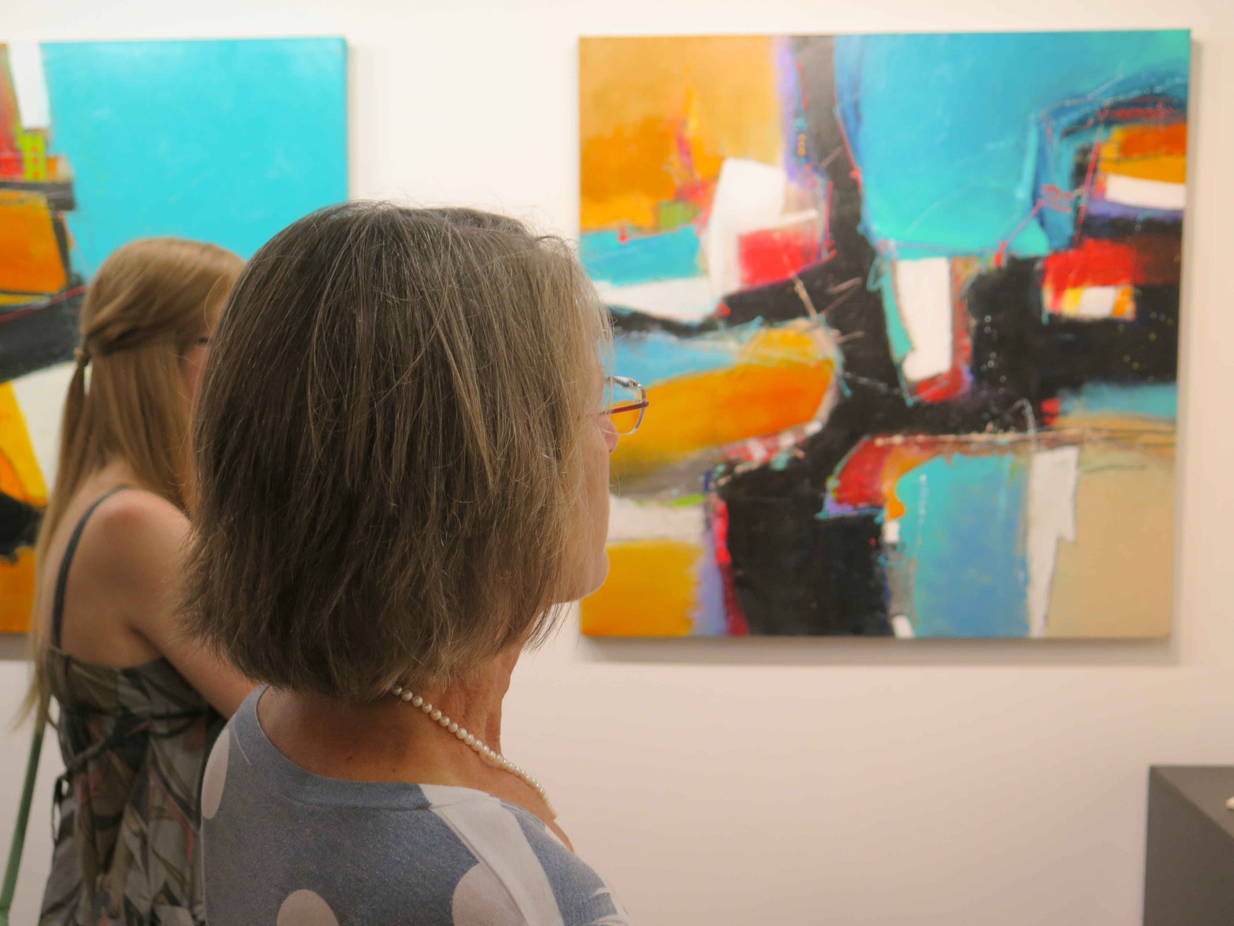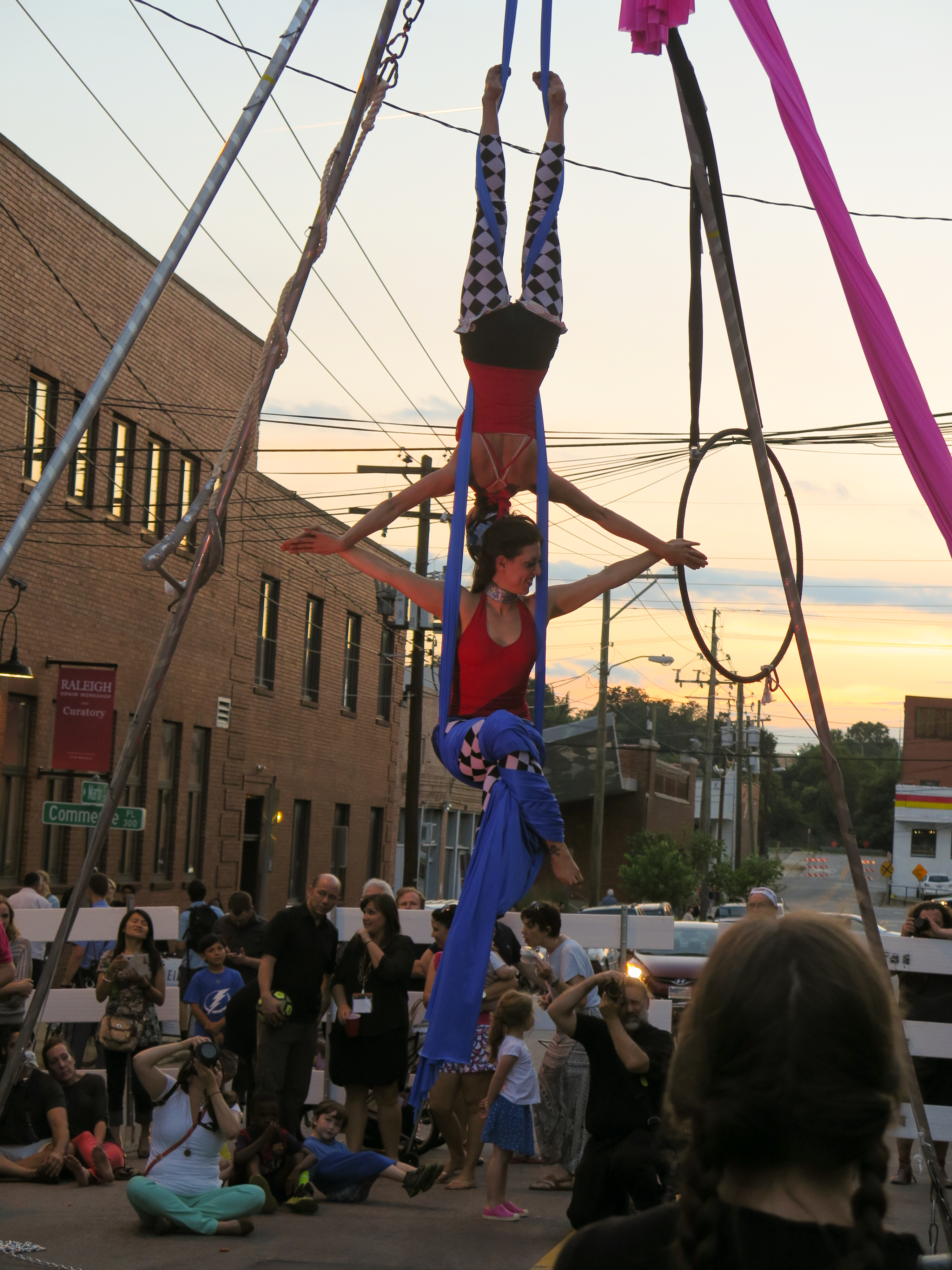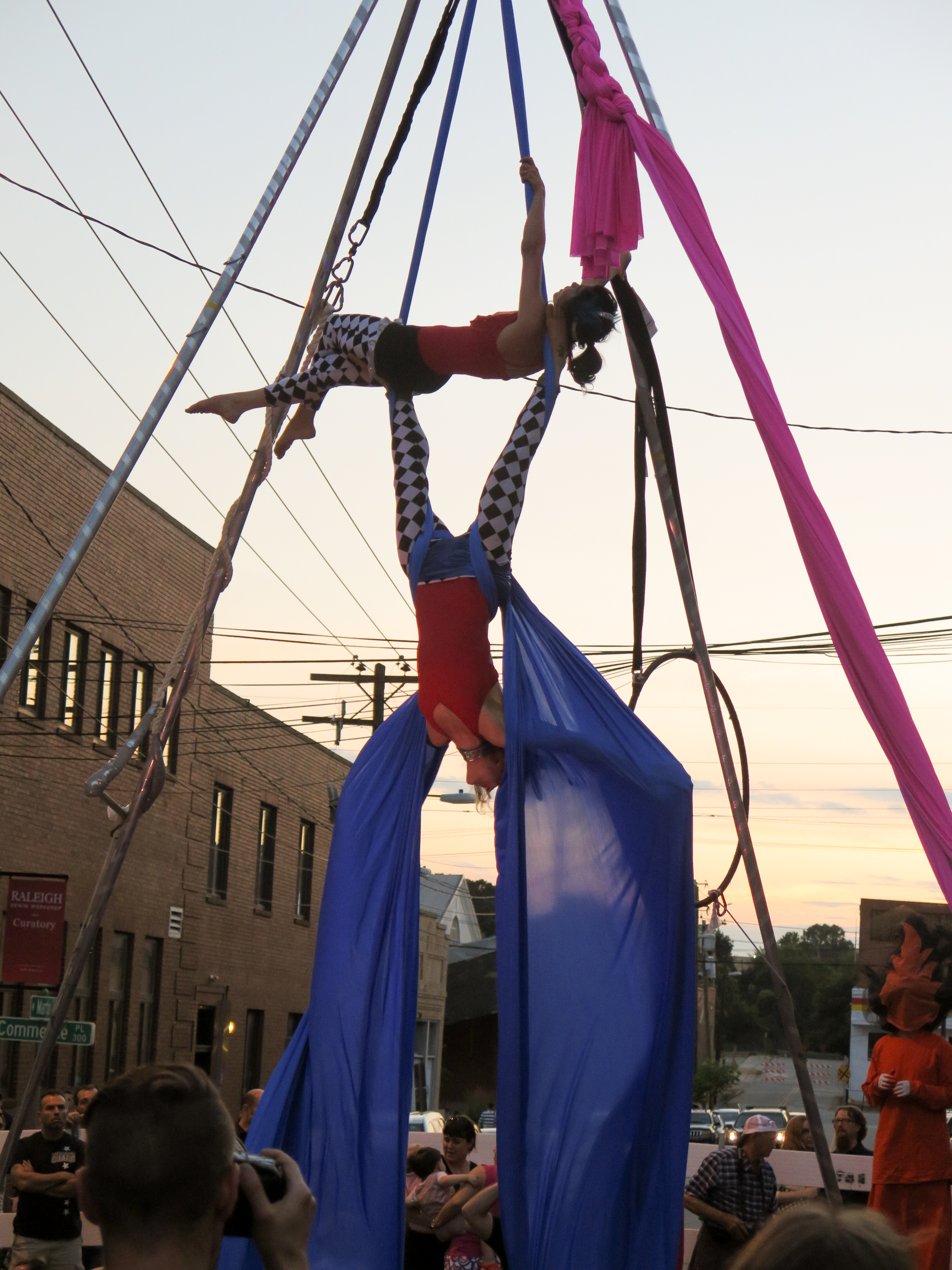 Then we looked in some galleries that were open late for First Friday. At ArtSpace, there were several engaging paintings that had been in a competition, and also some old friends to chat with. In the warehouse district, there was a mini-street fair, with circus performers and musicians. 311 Gallery had some colorful abstract paintings by Joseph DiGiulio that we particularly enjoyed.