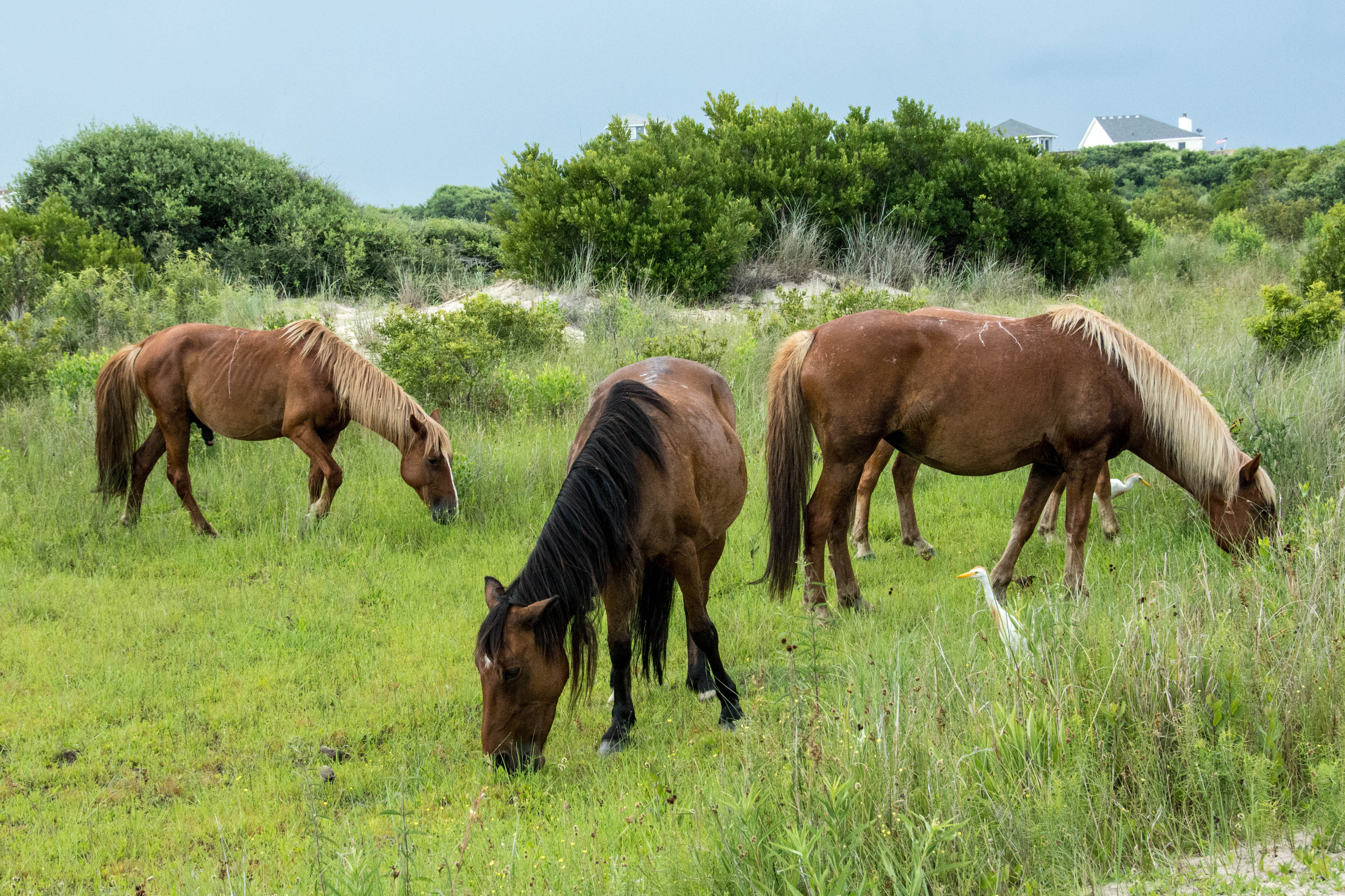One afternoon three of us signed up for a wild horse tour — that is, a four-wheeling trip along the beach north of Corolla and up into the dunes to look about for the resident wild horses. We had some good luck, and found a group of four eating before a storm moved in. I felt a little better about getting stuck after I saw dozens of vehicles having the same problem.