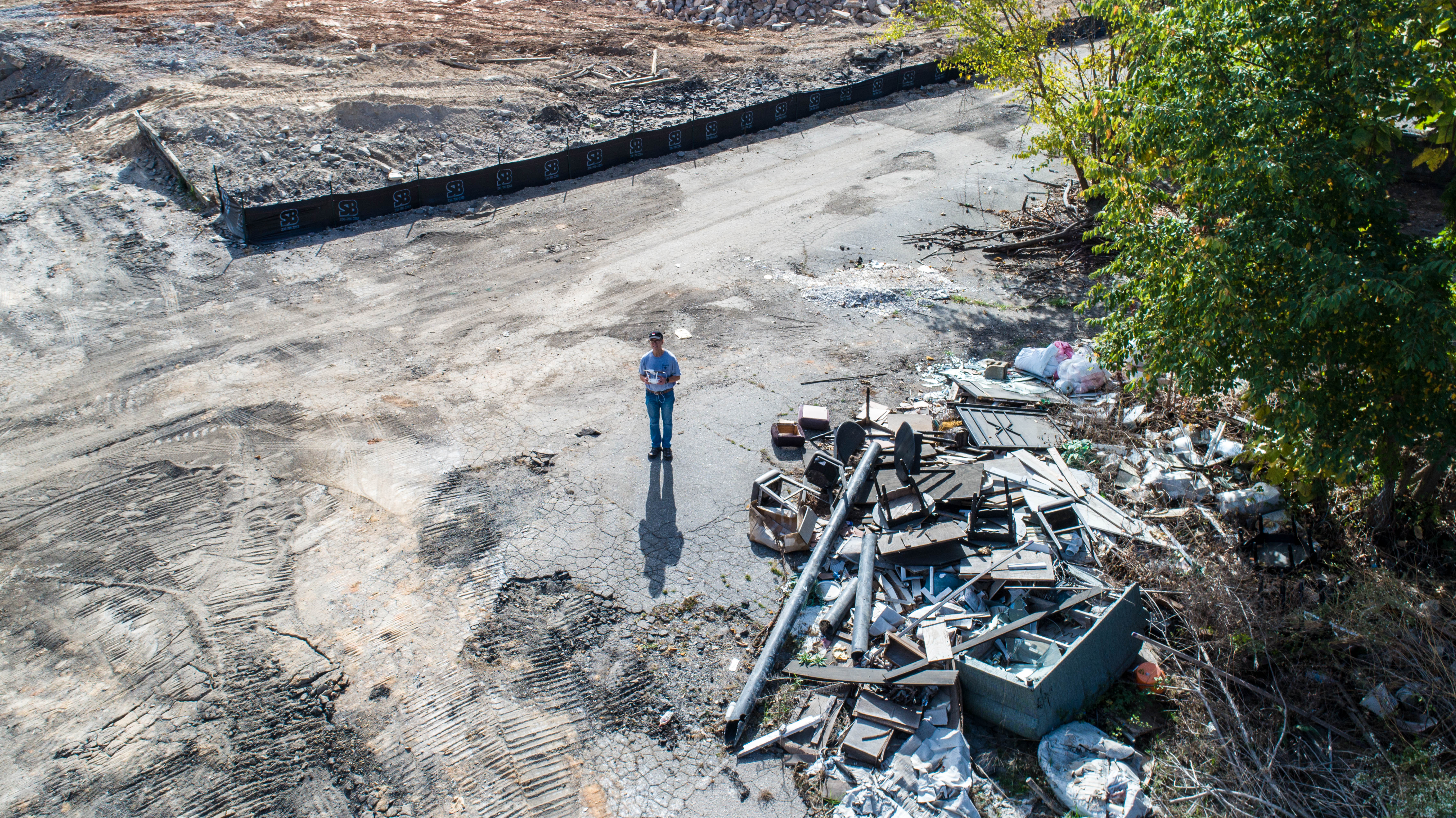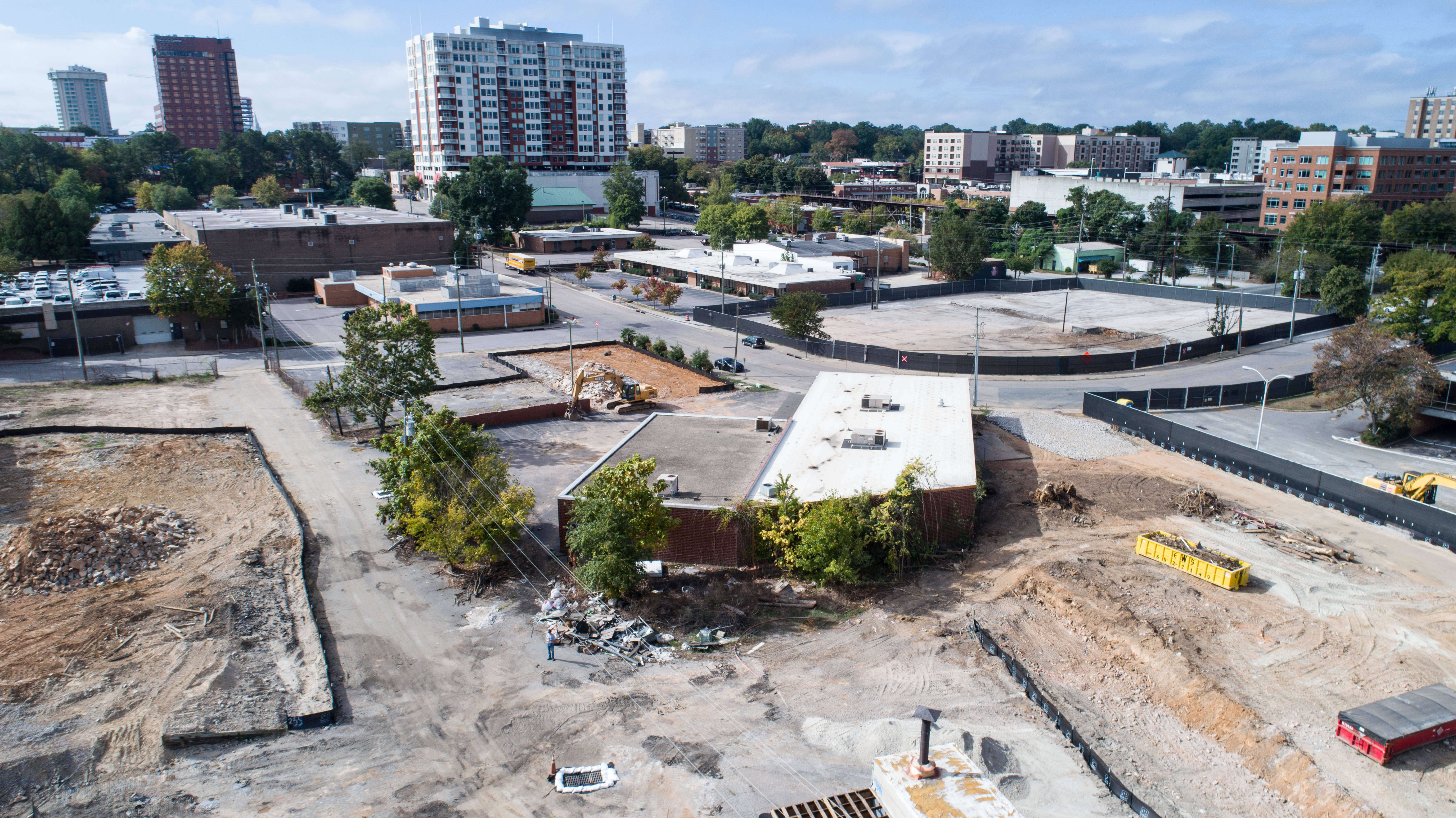 In our neighborhood there’s a tremendous amount of construction going on, and also deconstruction. Just a couple of blocks to the north and east, several buildings have been taken down in the last couple of weeks, including Finch’s Restaurant and my favorite photo gear and advice spot, Peace Camera (whose business is now located at Quail Corners Shopping Center). The destroyed buildings had no particular architectural distinction, and it’s sort of exciting to see things changing and look forward to new developments, though at the moment it’s a wasteland. I took these pictures on Saturday morning with the Tiller Quadcopter.