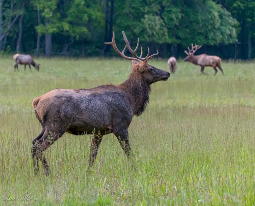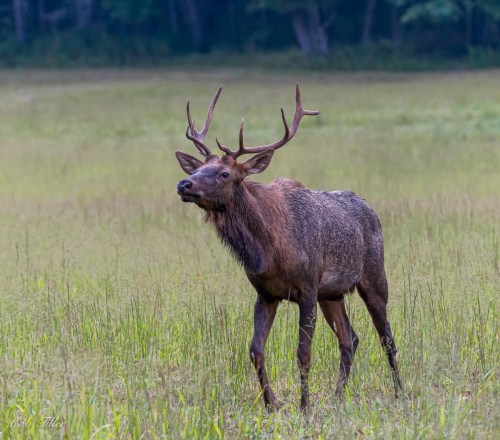 I got to spend some time last week with the elk at Cataloochee, NC. There were at least four different family groups, each with a bull who ruled over several cows and calves. Late in the day, the bulls called to their families to gather them together, and their trumpeting was powerful, with harmonic overtones. The elk seemed to understand each other from sounds and gestures as they slowly got organized to go from the pasture into the woods.