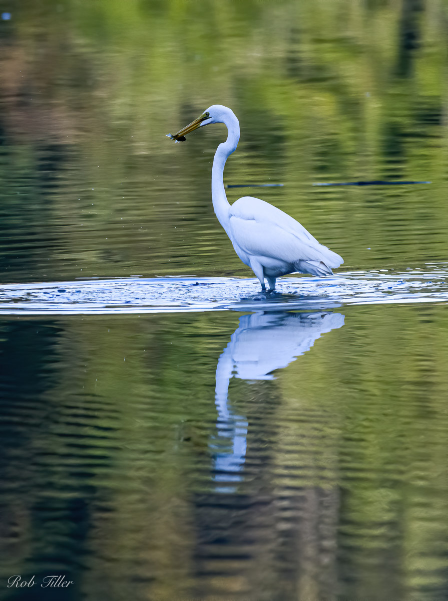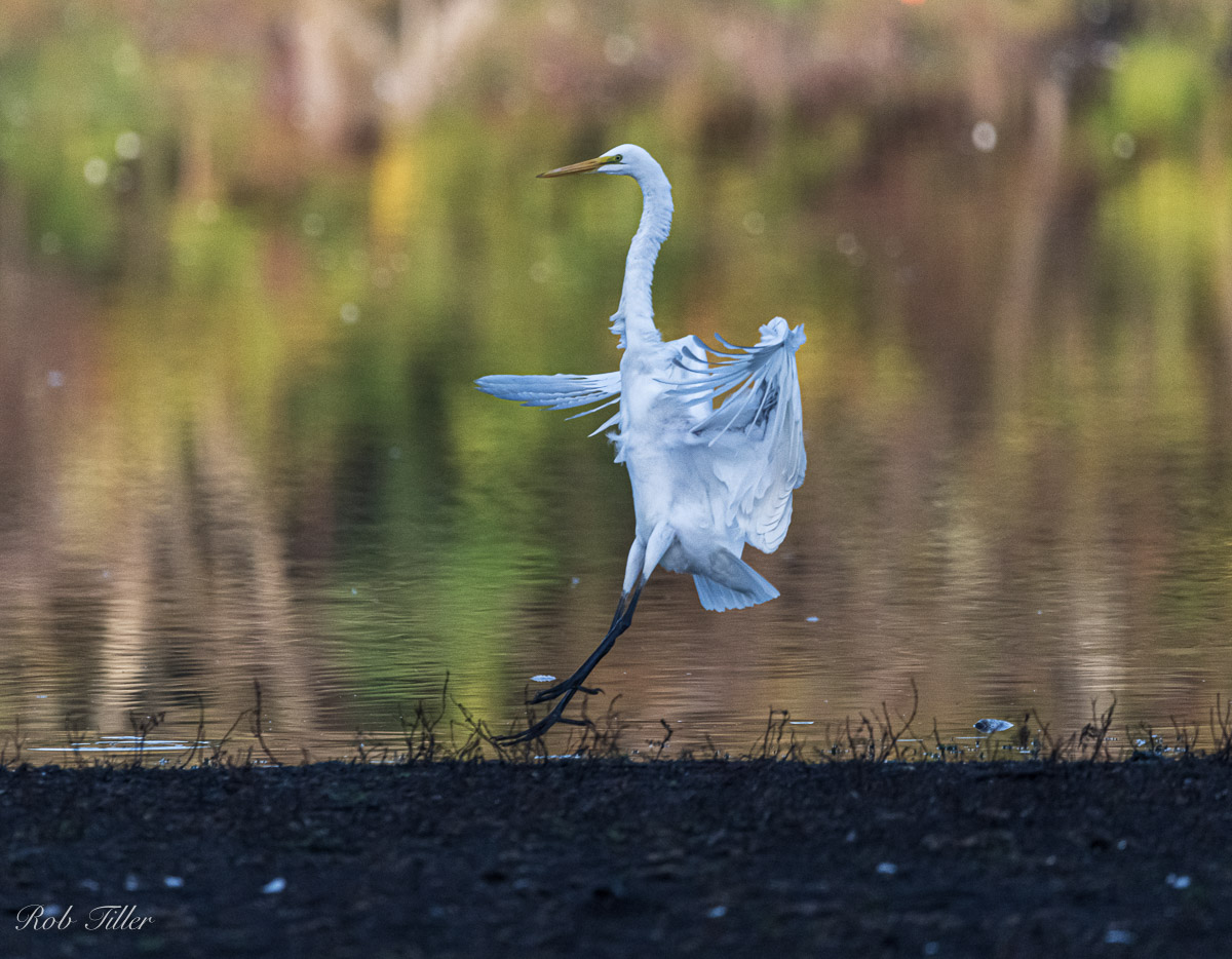 It turned cooler here last week, and the leaves were starting to glow at Shelley Lake. One day I saw three great egrets together at the other side of the lake. Usually, at least around here, these are solitary creatures. One looked smaller, and I wondered if they were a family. Anyhow, they were too far away to photograph well. Then one decided to fly right towards me, and the others soon followed. They spent some time standing in the water near me and did some fishing.