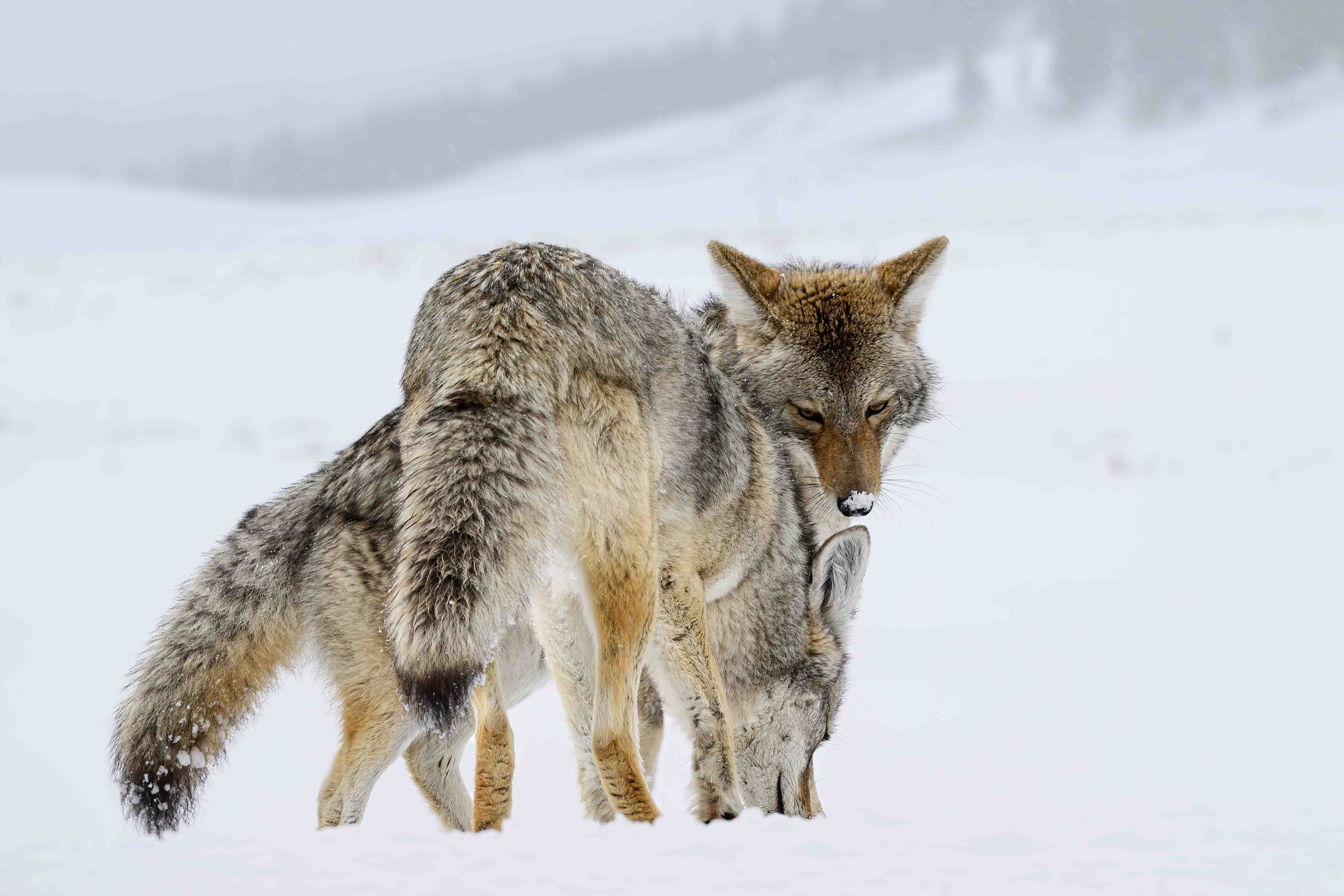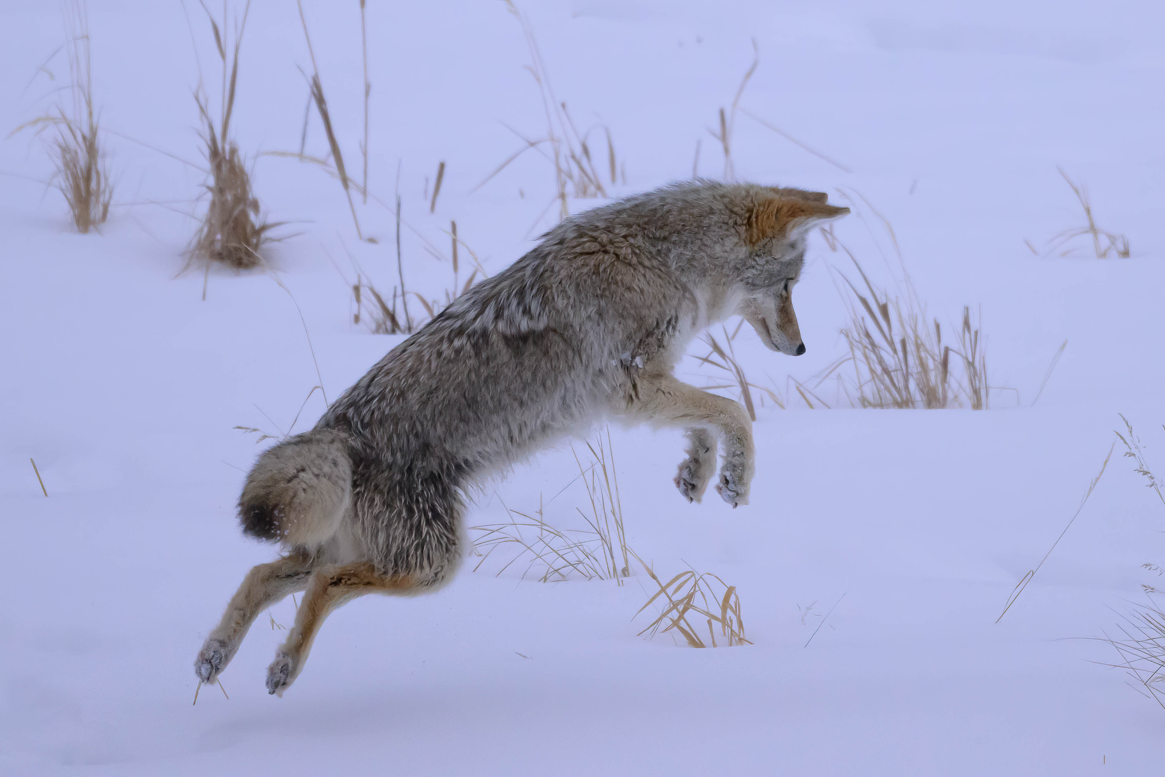 It’s hard to argue they’re less pretty than wolves, so their poor PR probably has to do with their being relatively common. Their prey includes mice, which they can hear tunneling under the snow, and catch by leaping on them. I got one shot of a leap, which yielded no mouse, and also saw a pair of them flirting.