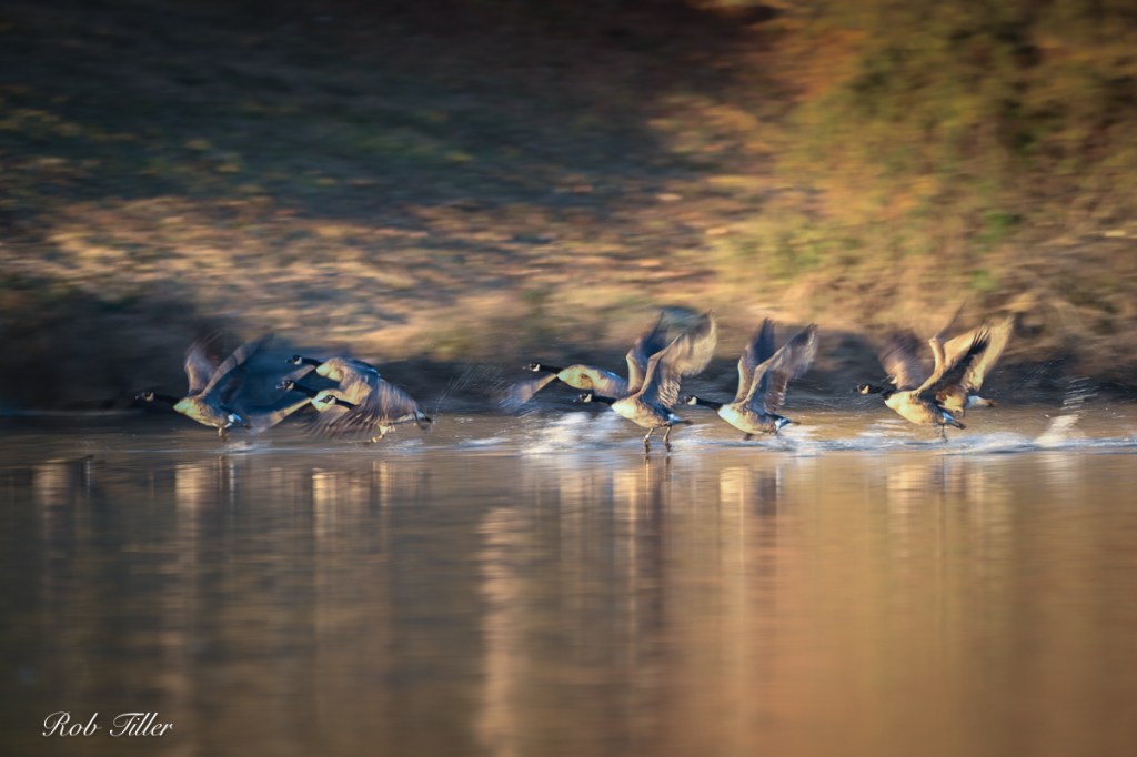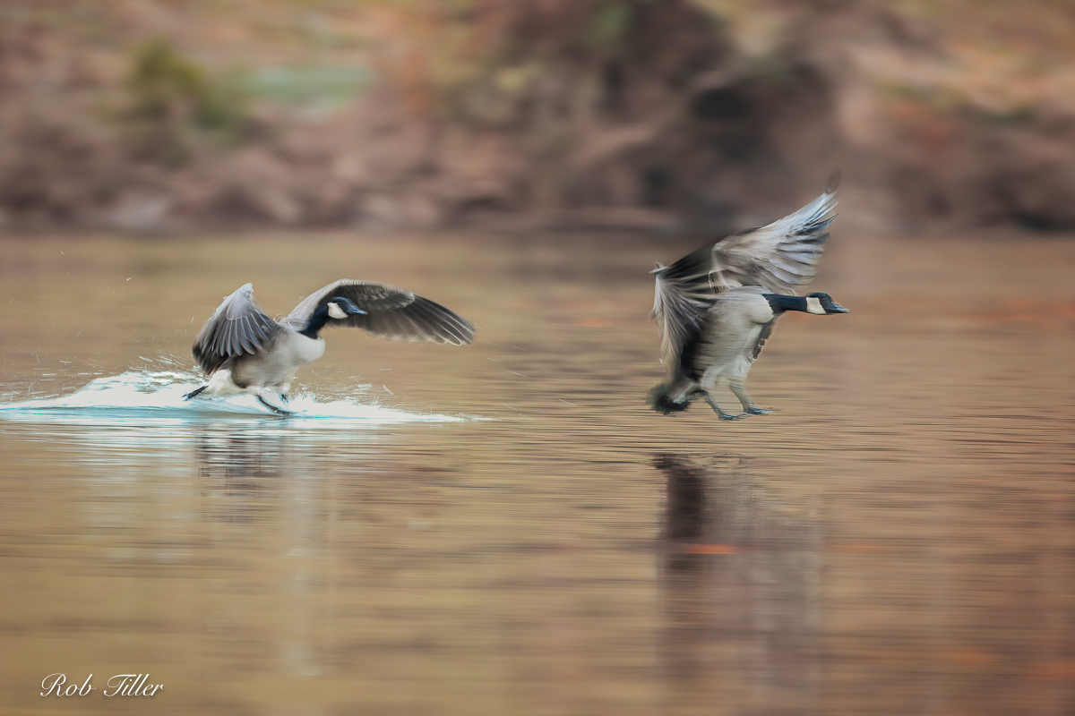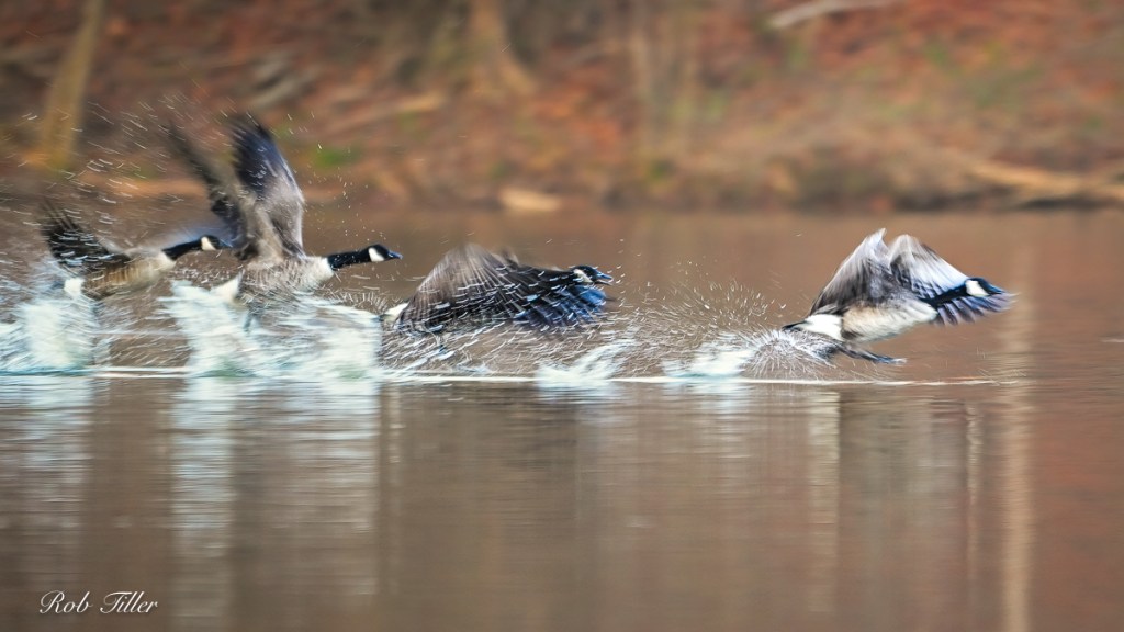 I like sitting there with the Canada geese as they paddle about, honk, and eventually take off for their morning flying exercises. I’ve been trying to capture the wildness of their take offs and landings, with only limited success. The actual events are really exciting, but for photographic purposes the birds are usually too far away, heading in the wrong direction, or in suboptimal light. Or I commit one of a thousand possible operator errors. Anyhow, I’ve yet to get the perfect shot, but here are a few that I liked.