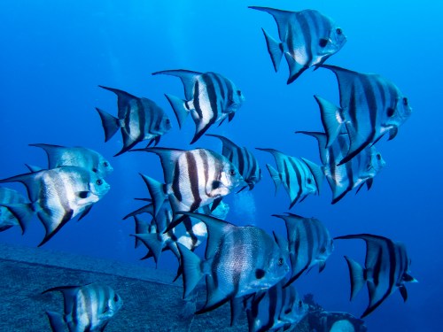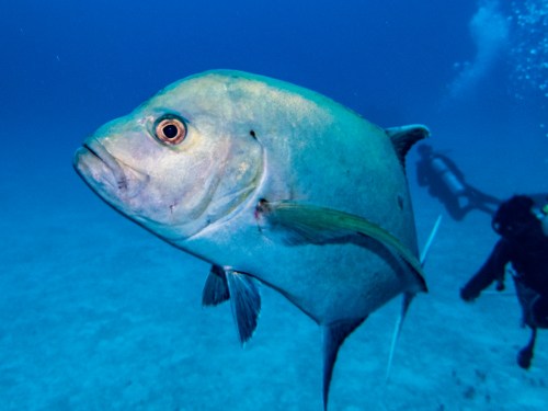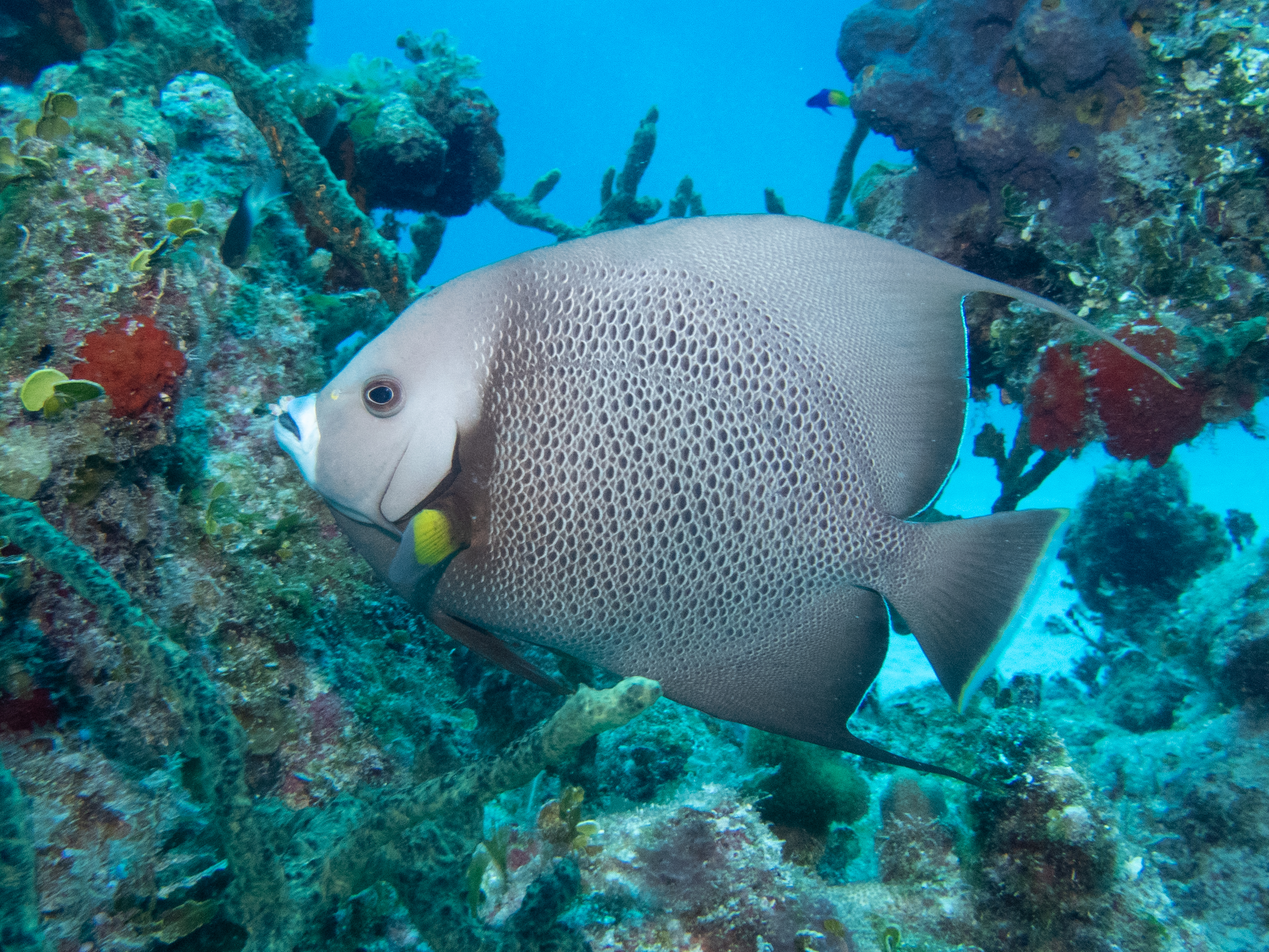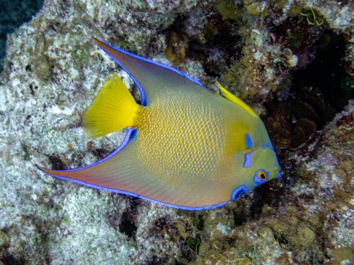 Even in our small area, there was a lot of variation in the marine life. Some of the coral seemed healthy and colorful, and other parts were brown and mossy, or bleached. There were a lot of small tropical fish with vibrant colors. Among the most enjoyable tropicals: angelfish (queen, French, and gray), butterflyfish (four-eye, banded), blue tangs, surgeonfish, durgons, trumpetfish, queen triggerfish, honecomb cowfish, balloonfish, porcupinefish, smooth trunkfish, whitespotted filefish, stoplight parrotfish, yellowtail snappers, and French grunts. We also saw a few barricudas, a few green moray eels, a few spotted morays, a few yellow stringrays, two magnificent spotted eagle rays, and one southern stingray.