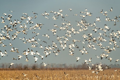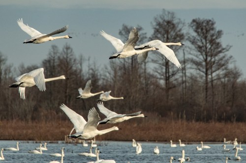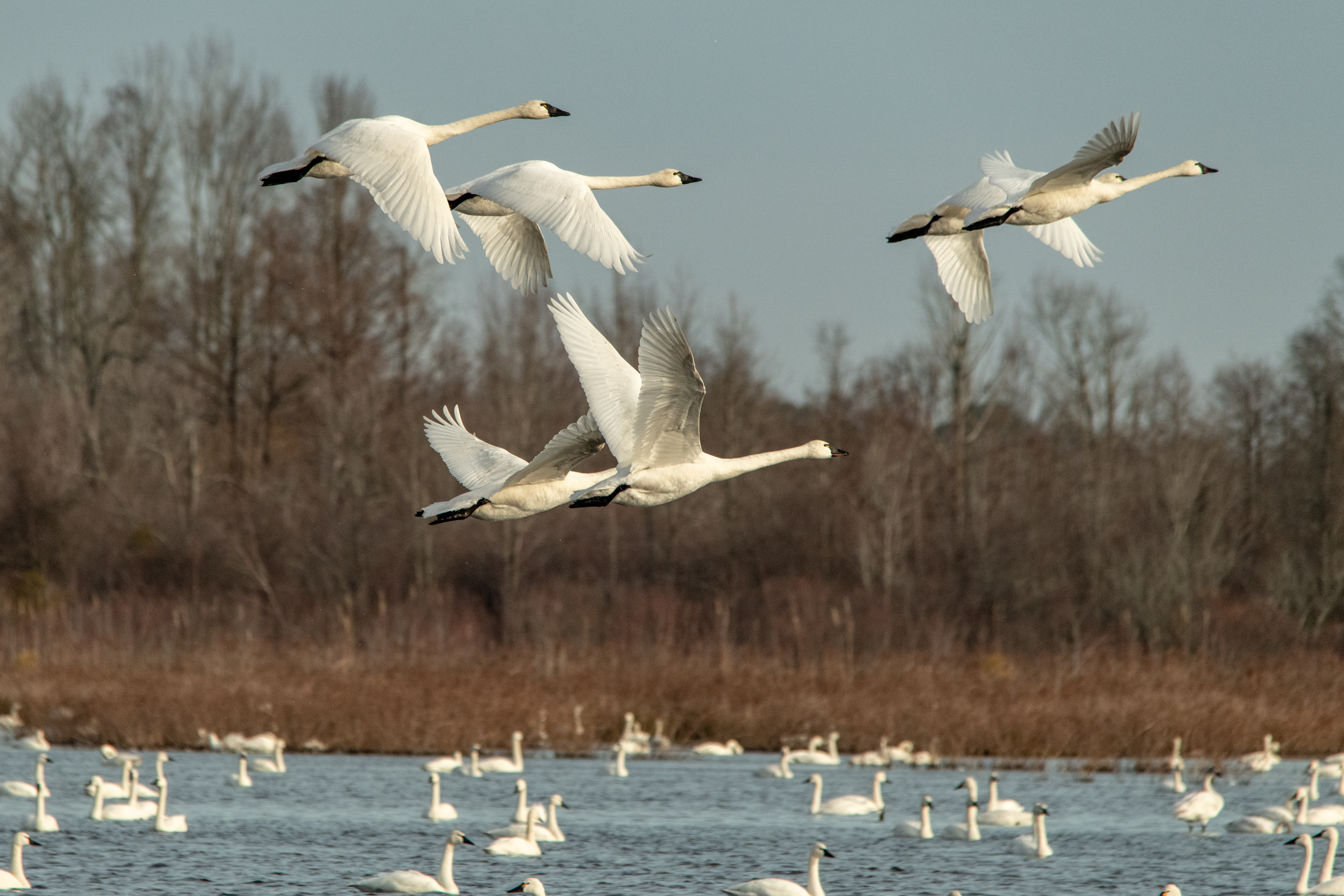 Tundra swans are big birds (think 6 foot wingspans, 20 pounds) that migrate thousands of miles every year between their breeding grounds in the Arctic and points south, of which eastern North Carolina is a major one. They are sociable creatures that can form flocks of hundreds or thousands. They’re very vocal, calling each other with loud honks, and large groups can sound like a stadium full of football fans.
