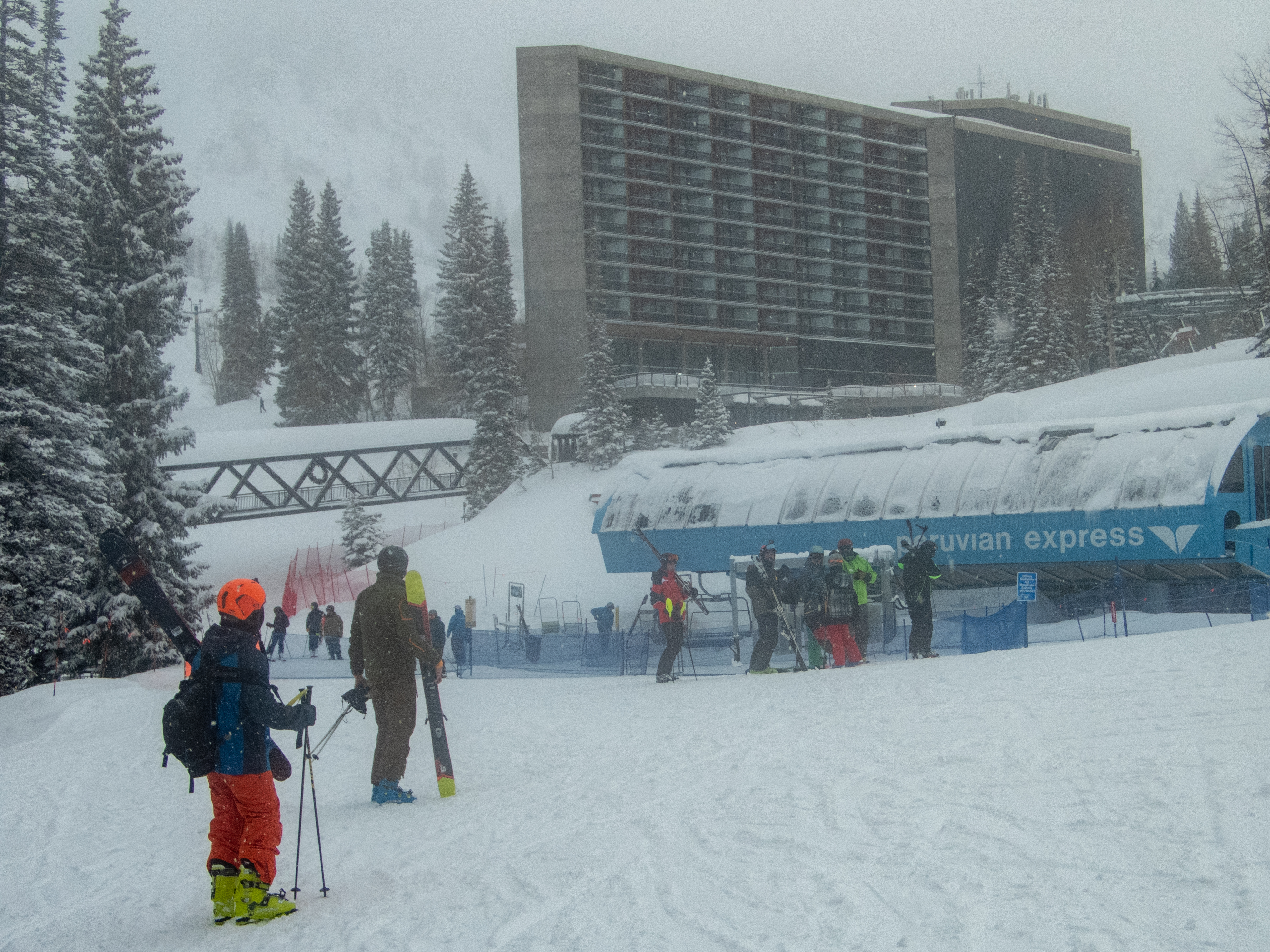 We rented skis at our hotel, Cliff Lodge (see photograph below), and they set us up with good tools. I was very impressed with my Volkyl 100eights (173cm), which were versatile and reliable. They floated beautifully, were highly maneuverable on moguls, and could carve at medium-high speeds on packed snow.